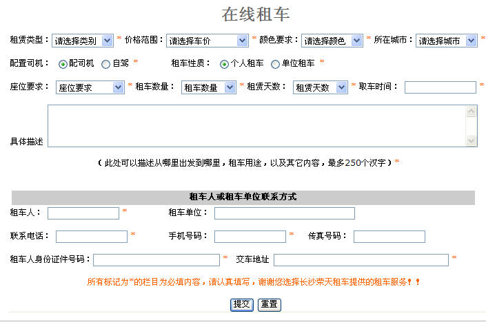 3、選擇或認真填寫帶"*"的欄目,尤其是租車人或租車單位的詳細信息。認真填寫上述必填信息將有助于我們及時和您取得聯系。